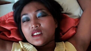 Shaved slit of super hot Asian damsel creampied